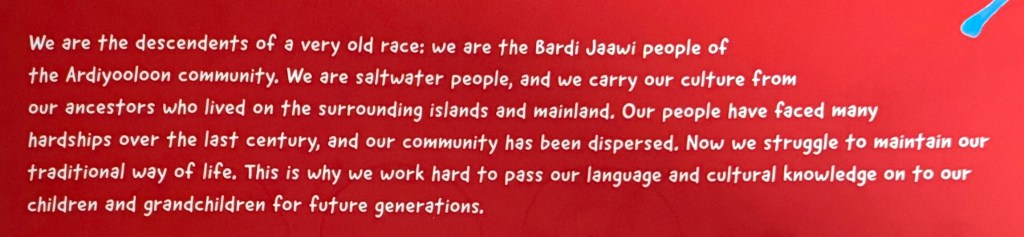 The kids at the local school have published a book discussing their traditional life, plenty of pictures and annecdotes. The Bardi Jaawi people are ‘sea people’ and live in it and from it.