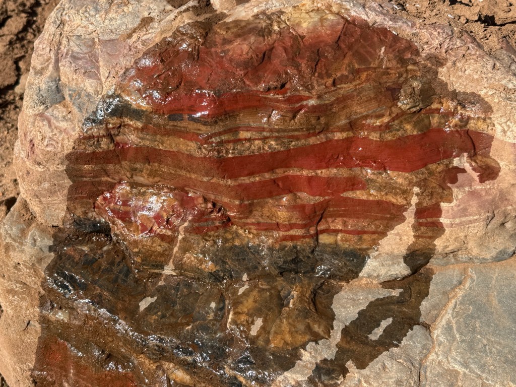 Tourists come here to check out the jasper field. This is a post card pic of the sight. Very colourful. Allthego is a bit puzzled by the pic and thinks it might be doctored a bit. He believes the colours don’t really show up like this unless the rock is wet. Could be wrong. Maybe a photographer was here just after rain. The location of the jasper had been recently cut off from the main track by floods that have removed a lot of sand between the rocks.