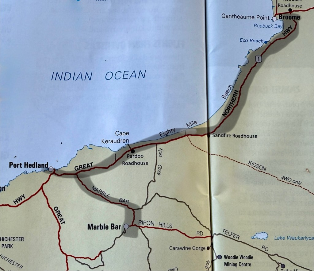 Here is a map of where we have come from and where we are going over the next few days. We have come down from Broome (top right) along the Great Northern Hwy and stopped at 80 Mile Beach (in the middle). Now at Port Hedland and will be going out to Marble Bar on a day trip.
