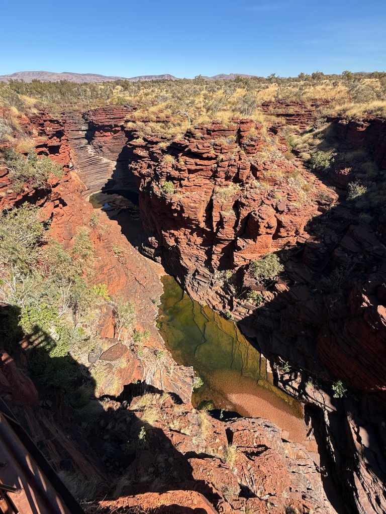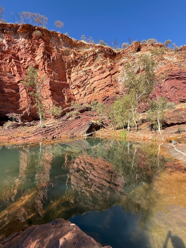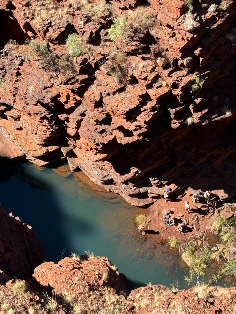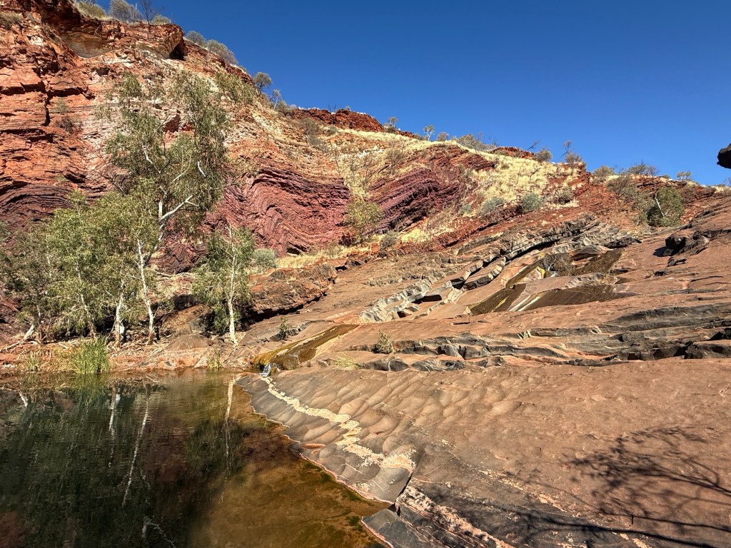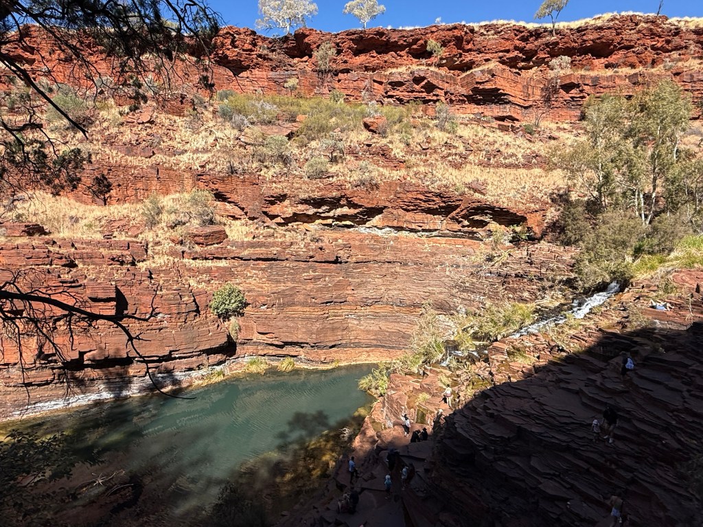 It is not a difficult descent into Hamersley Waterfall and Gorge. There are some amazing rock strata in the cliff walls and the gorge water hole is very picturesque. Well worth the drive there and back.