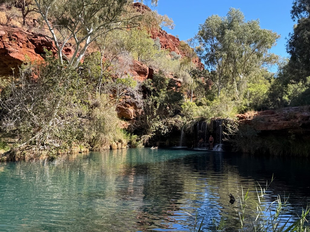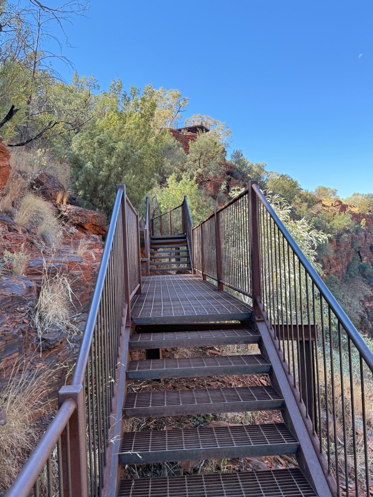 At Dales Gorge there is the Fortescue Falls and the pool at the bottom. A steel stair case takes one all the way to the bottom, some stops along the way to take in the view or have a breather, particularly on the way back up. A short walk further up the gorge is Fern Pool. Lots of people have a swim in this very deep and cold pool.