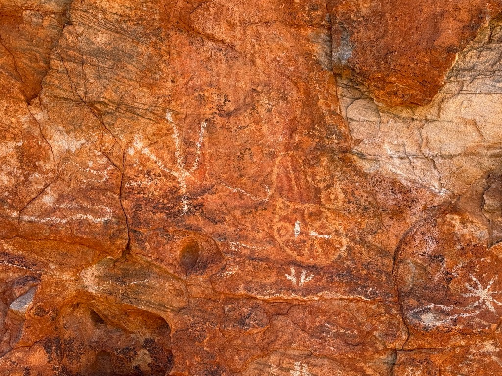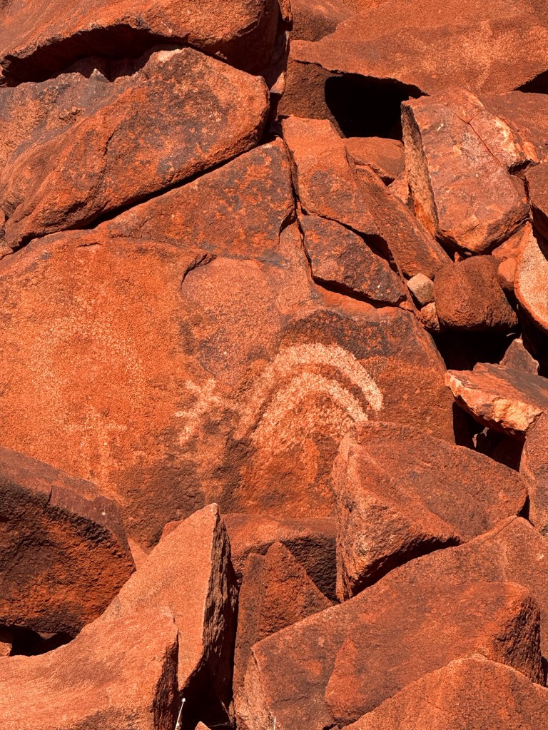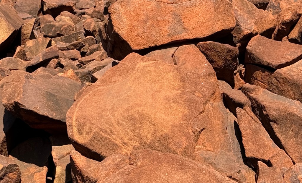This is because, apart from the decarbonisation issue, nearby there are some big piles (not a geological term) of very old rocks with numerous indigenous petroglyphs on them. The concern is that all the industrial activity going on will ultimately destroy these images. It is claimed some are up to 40,000 years old. They are not rock paintings, like in other places we have been, but etchings in the rock faces. There are animals, images, implements and human forms represented on the faces of the rock.