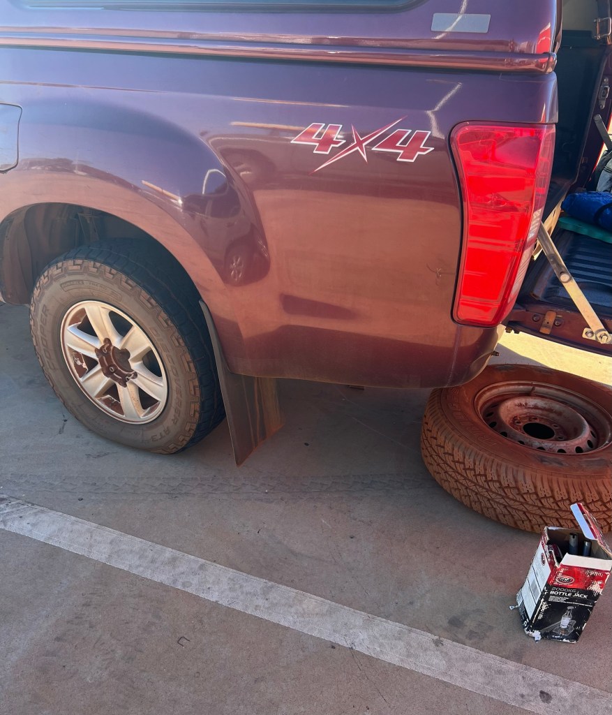 As we were doing this a fellow nomad next to us pointed out that the back tyre on the truck was partly deflated. Allthego looked and he too became deflated. A flat. A bolt through the tread and thus a slow leak. Lucky we made it to the Servo, no idea where this happened. The spare came out and a quick change was completed. Found a repair place to take the tyre to the next day.