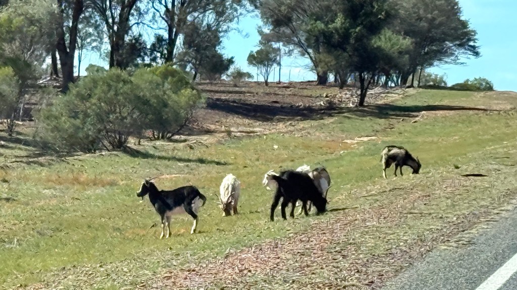 Goats are also present in amazing numbers along the roadside and in paddocks. They are now being farmed like sheep and cattle. There is a big international market for their meat. Small problem is that they are hard to keep in paddocks as they can get through traditional fences set for sheep and cattle. They are smarter than those beasts, so they duck through the fences and wander along the roadside.