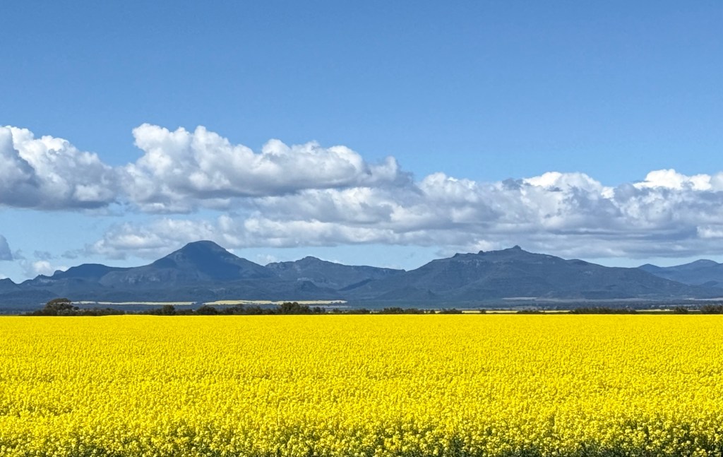 The paddocks are ablaze with the bright yellow Canola crop and the Mt Kaputar ranges in the background look great against the blue sky. The spring crop is presently a bright green contrast, yet to flower.