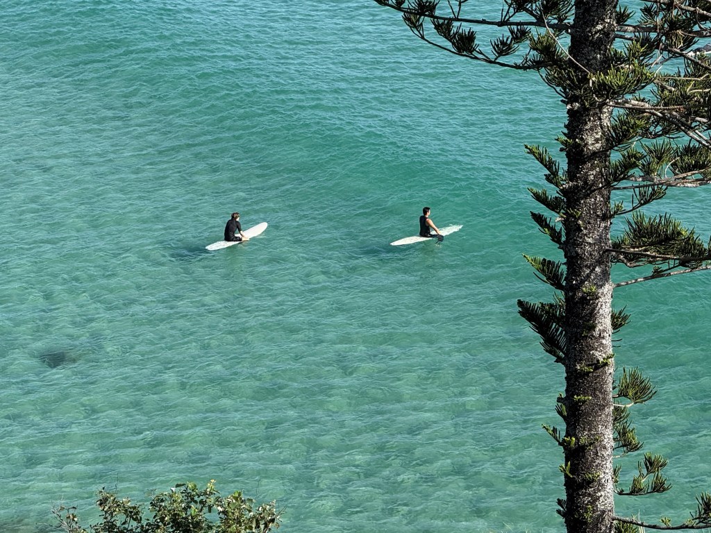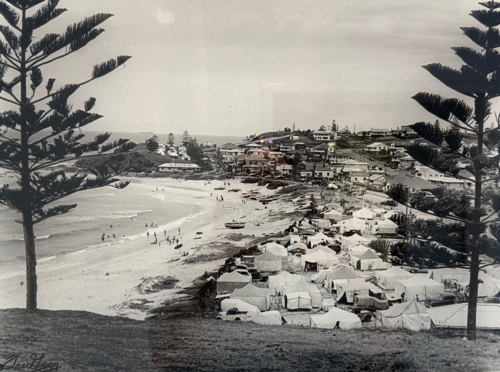 The units we stayed in had a picture on the reception wall of Rainbow Bay in what was probably the late 1940s early 50s, big camping ground with what looked like army surplus tents and basic little trucks and cars. It was taken grom the headland I believe, so I took a comparison photo of the scene today.