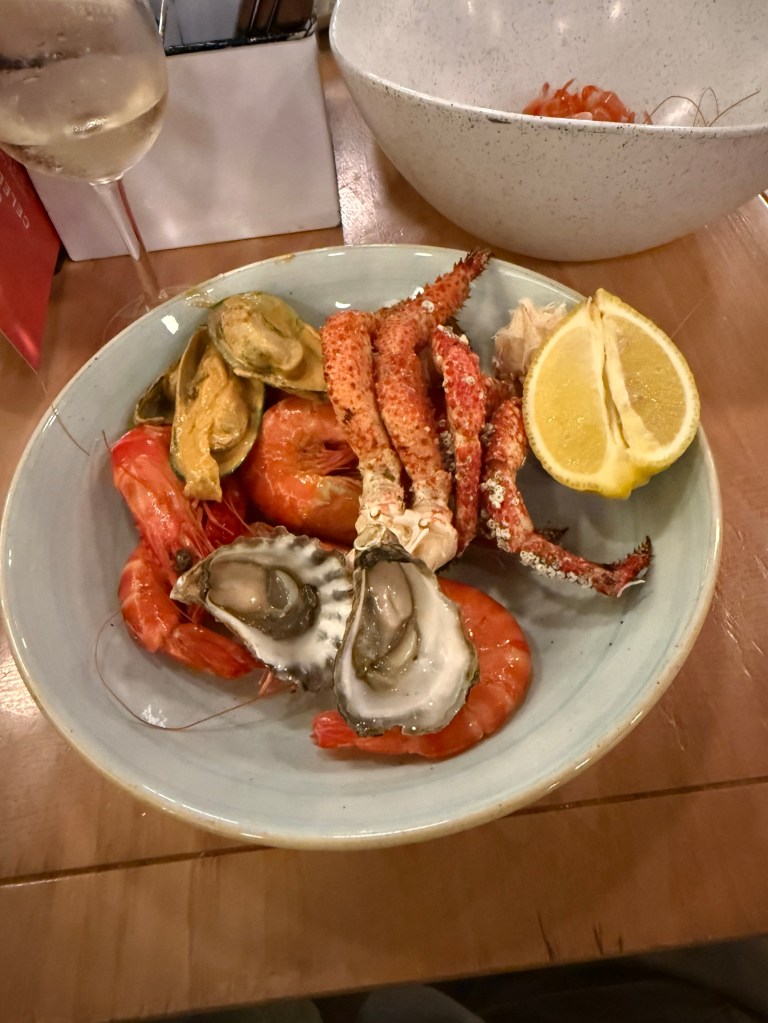 The crab legs were a battle to get into, a bit watery too. No lobster! Homealone focussed on the prawns. Then there was an array of other stuff, seafood chowder good and some nice southern fried chicken wings. Roast lamb. Bread and Butter pudding and custard to finish.