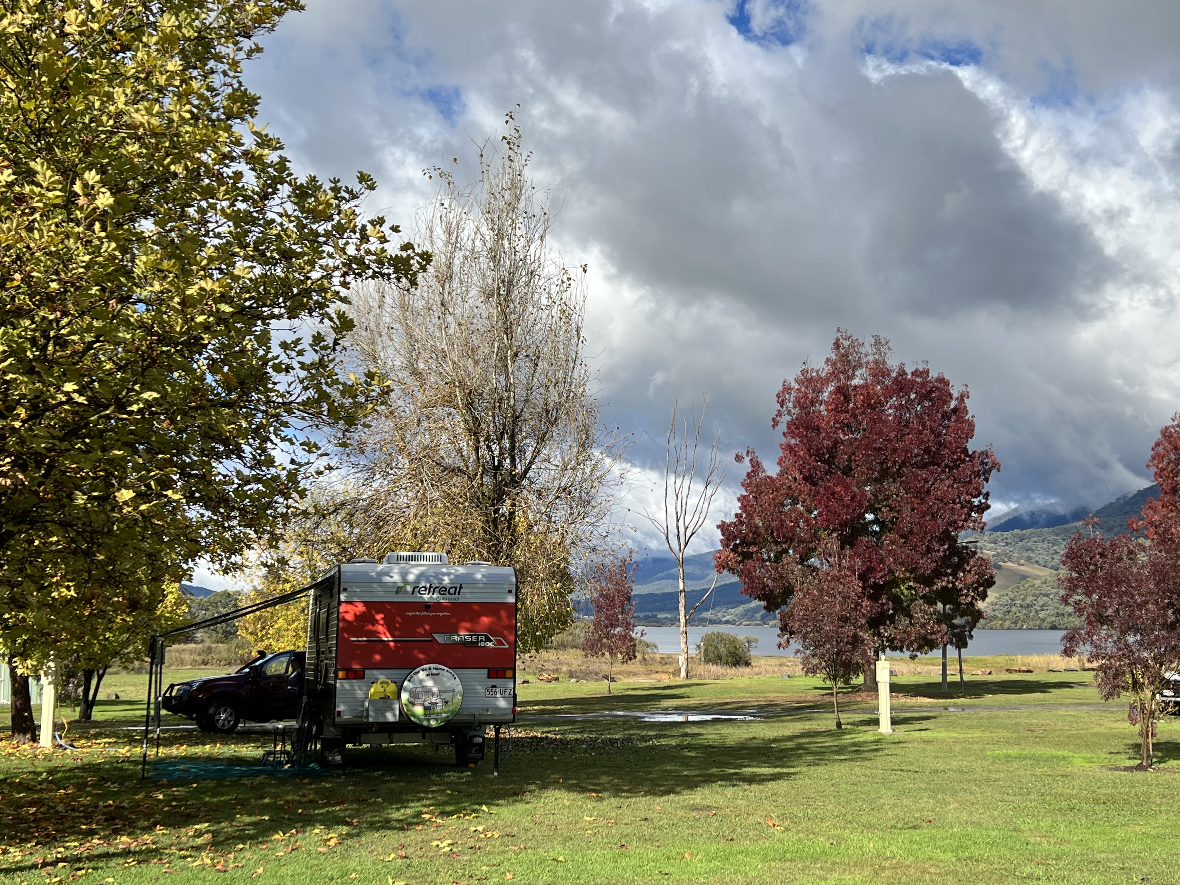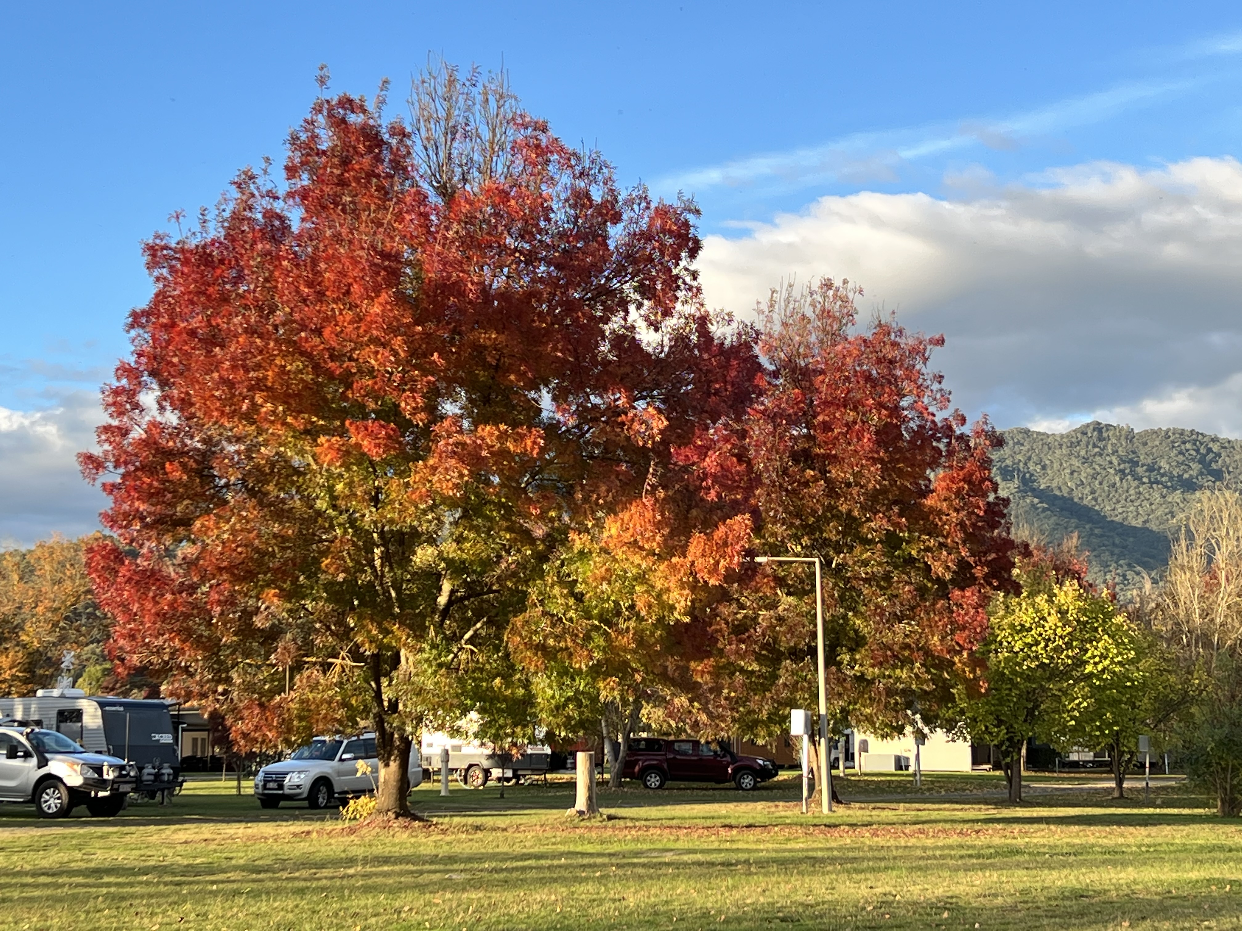 We have made it to Tumut. This is a neat little town and we are camped on the banks of the Tumut River a few hundred metres from the centre of town. Sort of too far to walk but not far enough to drive. So it depends what mood you are in and what you have to carry back of course! Allthego set off early one morning along the river walk, very pleasant stroll into town. The objective was to pick up a loaf of bread for breakfast from the local bakery, but what does one find at a bakery, all sorts of goodies. So back he came with some bacon and cheese topped buns and a custard tart, as well as the bread of course. Carting this stuff back resulted in the bread being a little crushed in order to save the rolls and the buns. The buns though were excellent along with some bacon and eggs for breakfast beside the shallow swift flowing river. This part of the world is now showing the full colours of the autumn transformation. The poplars, elms and liquid ambers are golden in colour with splahes of orange and red here and there. Fallen leaves cover the campsite.