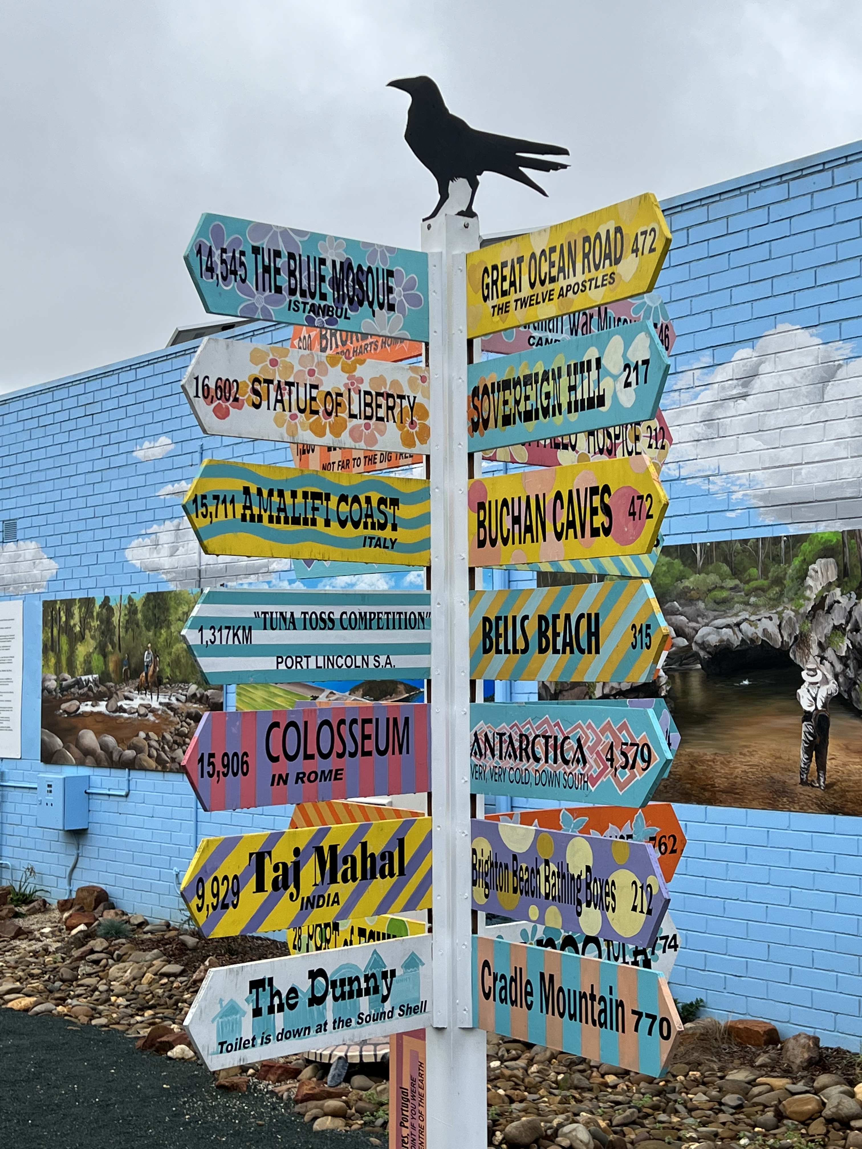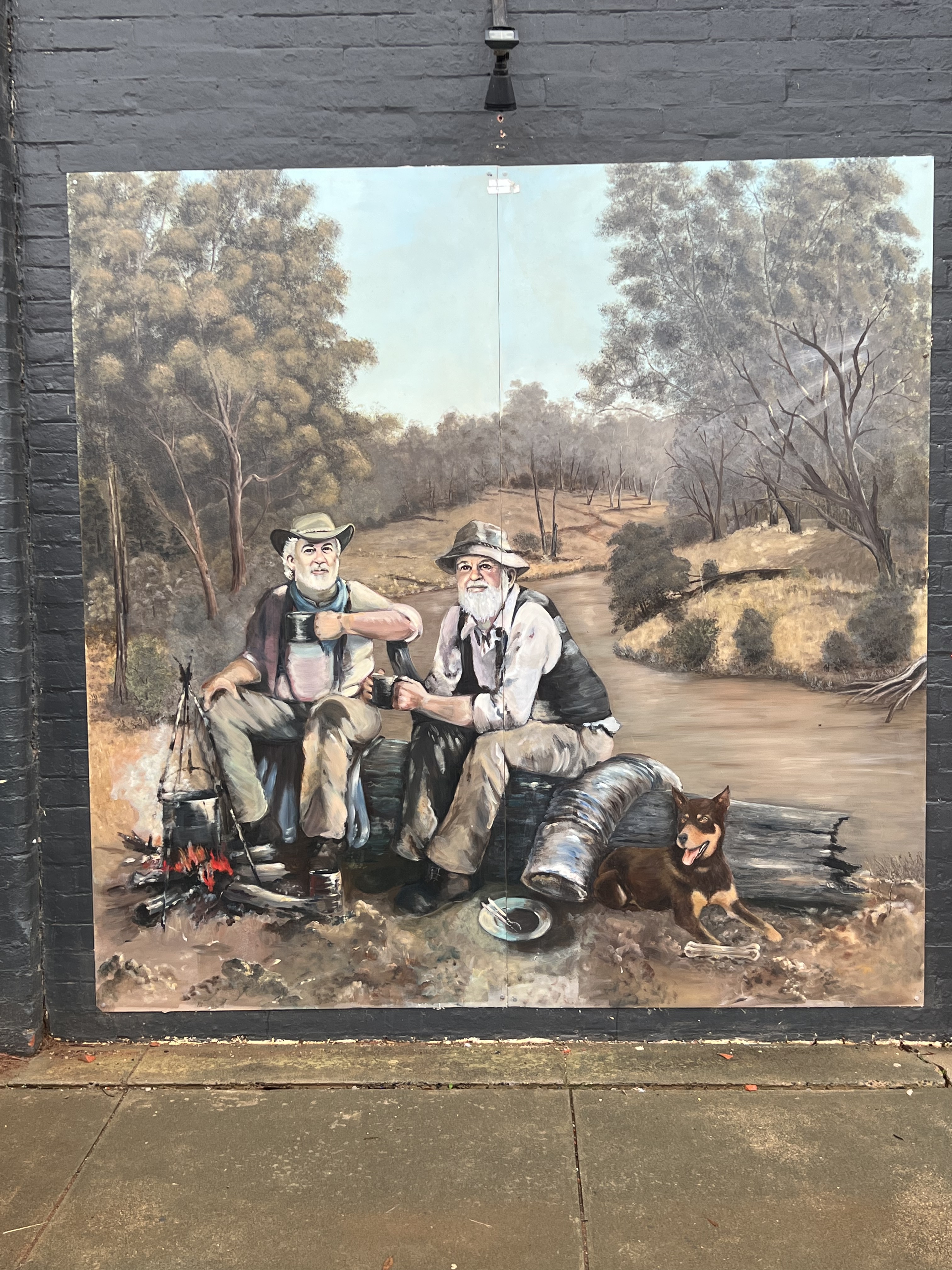 We are at Echuca, albeit down by the Goulburn River about 20 km out of town. The sun has come out a bit and we have decided to head off on a regional drive to take in some of the scenery away from the town. We seem to be between planting seasons, many of the paddocks are either fallow or have recently been ploughed, not sure what they grow around these parts. The irrigation ditches are full of water though and criss cross the countryside. Plenty of dairy cattle and some sheep are around. We stopped off in Tongala, a milk place, to check out the towns murals and street art. Murals are a thing here and they have an annual festival to promote the action. Despite being a small town they not running out of walls to adorn.