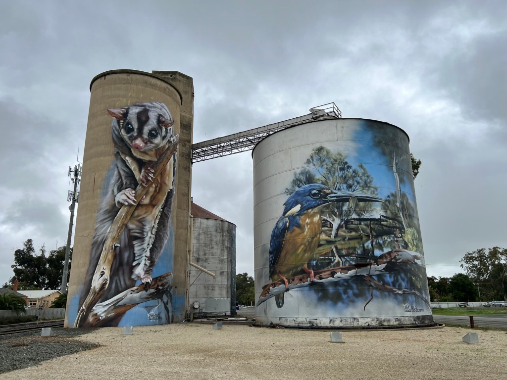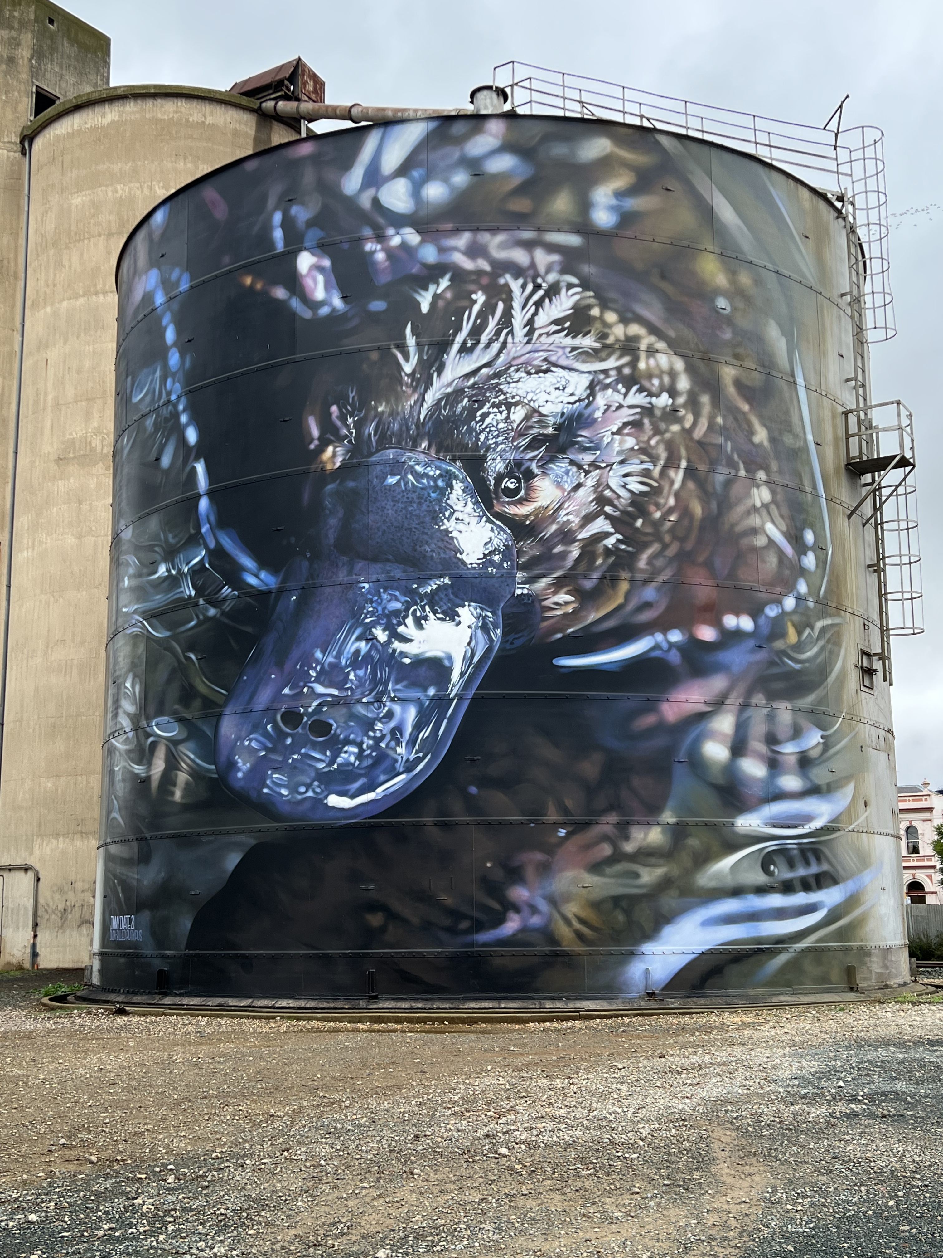 From Tongala we moved on to Rochester to see some some silo art, quite impressive work. Three silos have been painted up, the most recent with a platypus. It actually looks wet and its eyes stare out at you. A great attarction for the town.