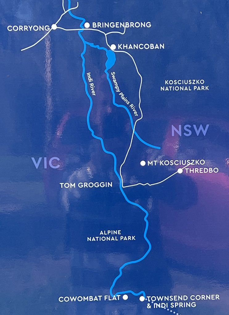 The Murray, also known up here as the ‘Indi’, an indigenous name perhaps meaning ‘you’, rises on the western side of the range in quite remote country near a mountain named The Pilot, but more about this later from Tom Groggin.