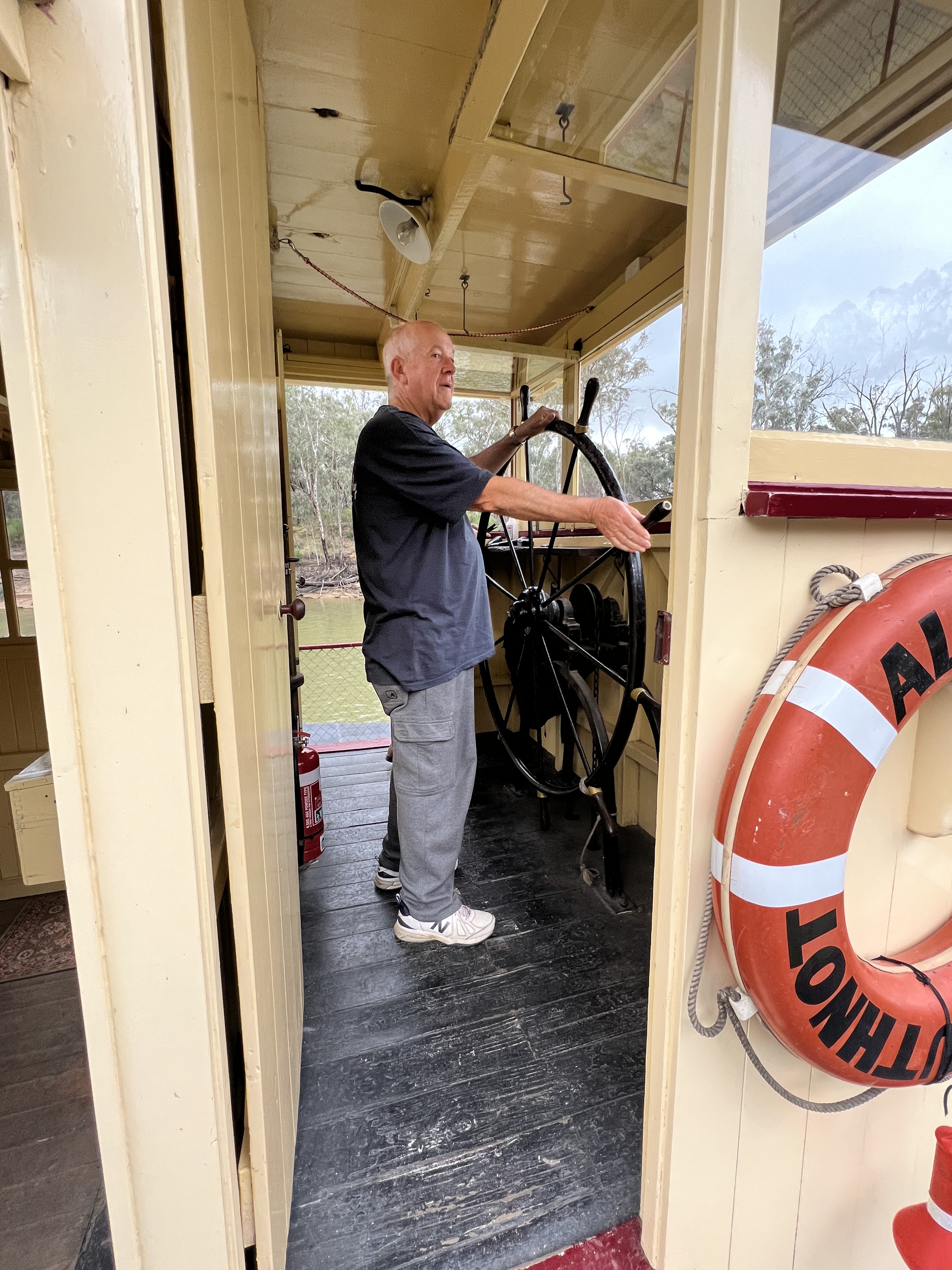 Back in Echuca we have made it down to the historical wharf precinct to look around and join an afternoon cruise on the PS Alexander Arbuthnot up the Murray for about half an hour and then back to the wharf. Allthego took control of the wheel at one point but was not able to execute a turn despite his past experience on such a manoeuvre.