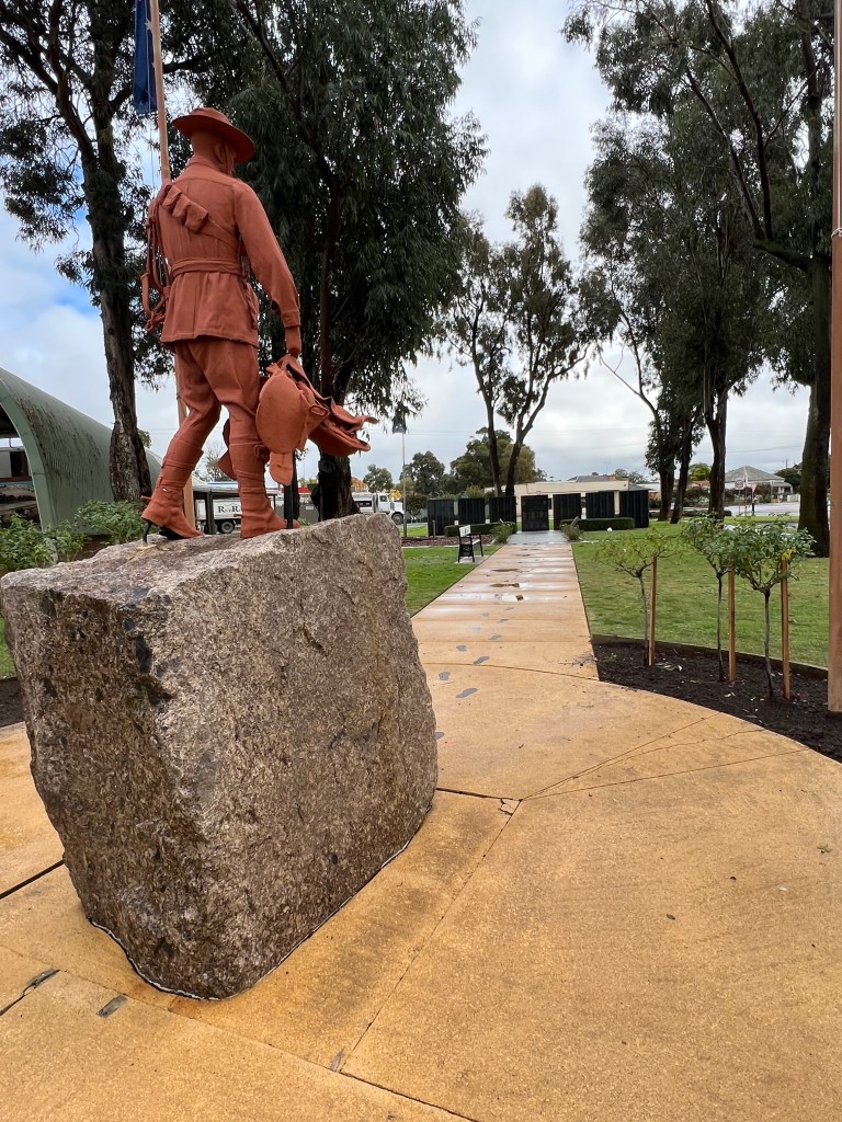 There is an interesting war memorial in the town that connects the WW1 campaigns of the Light Horse Brigade with the Vietnam campaign. Apparantly, the Light Horse brigade morphed over the years into one of the regiments that first set foot in Vietnem during that campaign. So Tongala has a memorial connecting the horseman of WW1 via a pathway to the Vietnam memorial. Quite involved but effective, as is their walk of honour of trees recently planted and plaques for 24 Vietnam veterans who didn’t return.