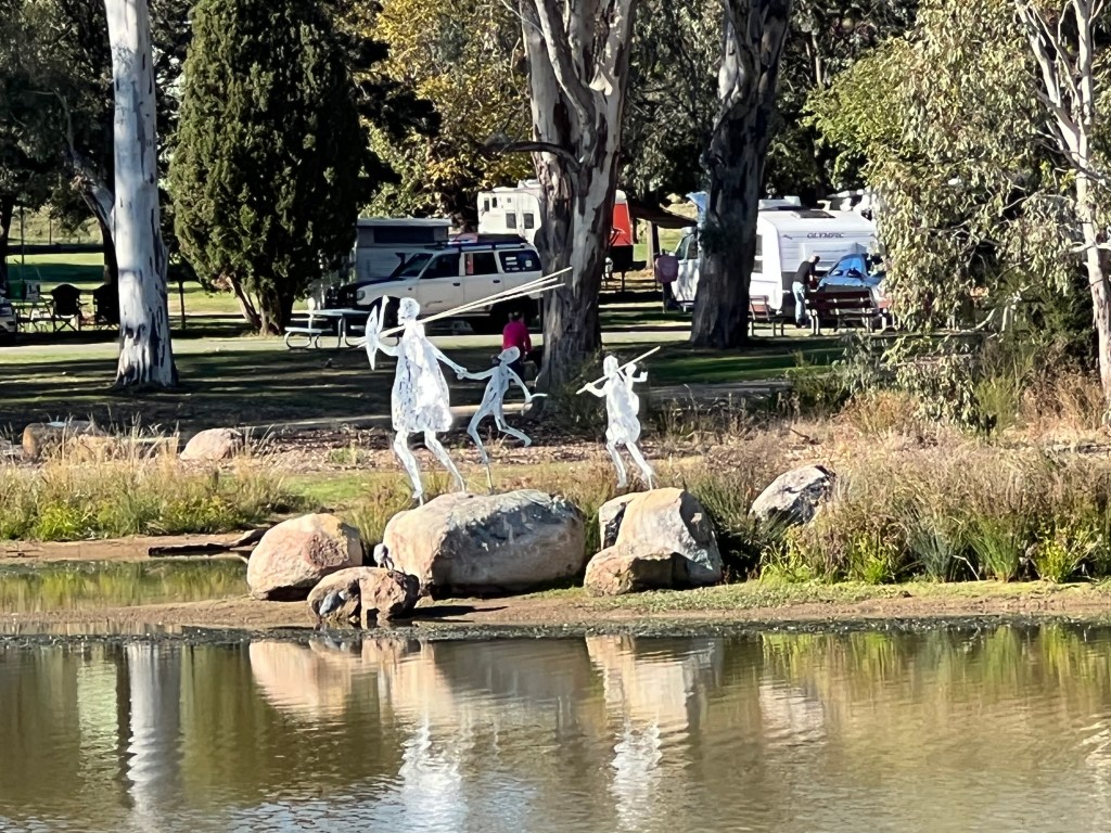 Followers may have noticed that various depictions of the ‘Murray Cod’ adorn the River banks at almost every stop we have made. There seem to be more of these than actual fish in the water. Catching the elusive cod is heavily controlled (NSW) by way way of bag limit (two a day) and size (between 55 and 75 cm only can be kept). There are possession limits too and rules differ between States and whether you catch them in streams or dams etc. All very confusing. There are closed seasons too to contend with. A 50 cm fish, considered a mature fish, may be anywhere between 3 and 6 years old. The biggest cod recorded was 1.8 m long and weighed 113 kg, a 50 cm Cod might be 2-3 kg. It is triuly an iconic fish!