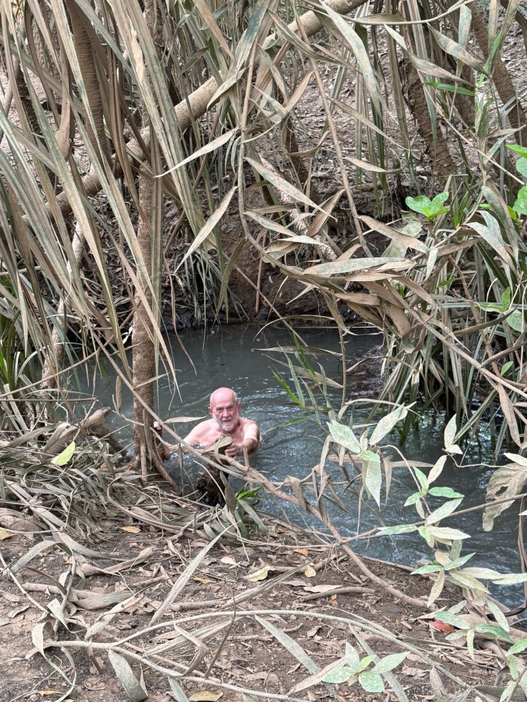 Below our campsite are the Katherine Hot Springs. 350 metres away. They are quite undeveloped thankfully. The spring rises from a smallish ‘hole’ in the bank and flows into a deep pool and then along a creek into a pool lower down. Ultimately the creek joins the Katherine River. Croc warning signs are up everywhere, but it looked clear to me, so in I went.