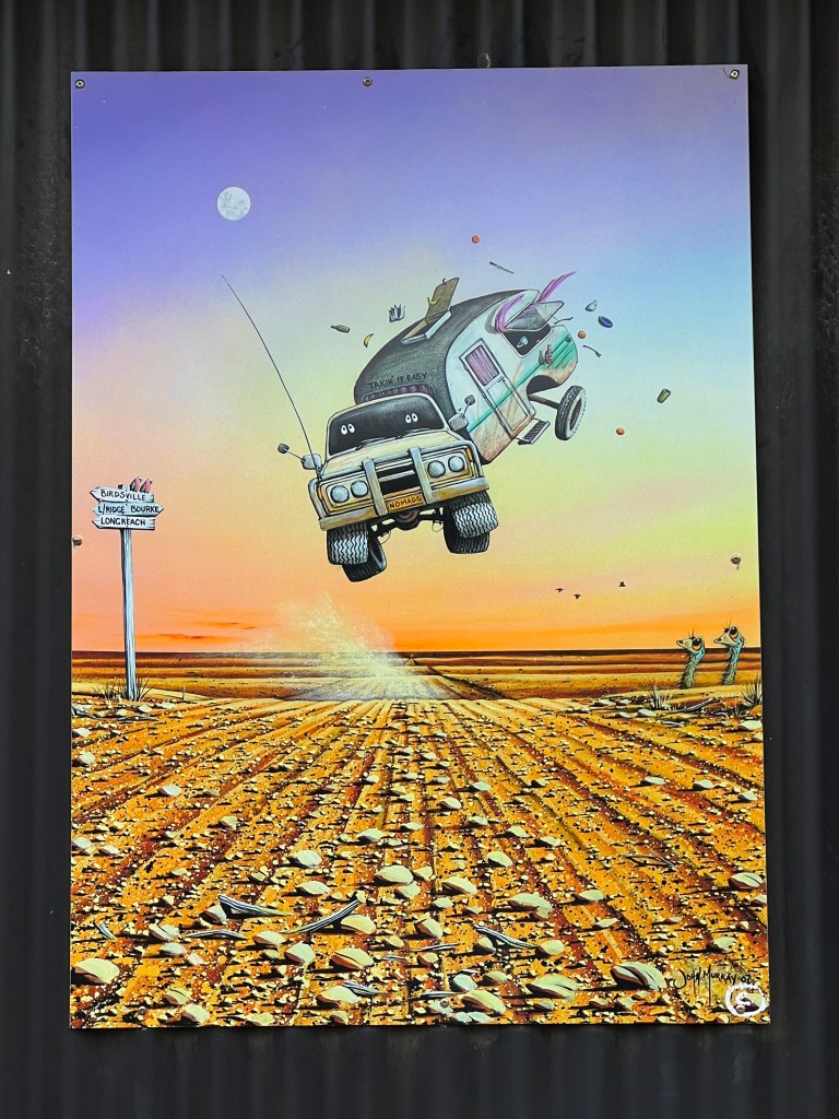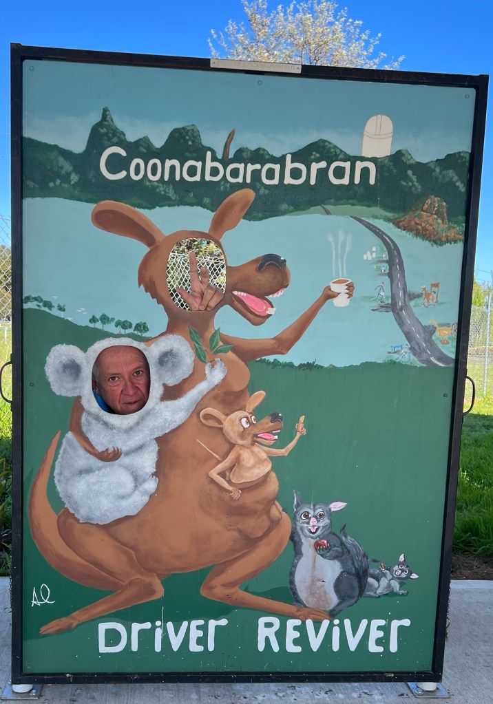 Back in town we had a look around the street art, mostly done by the local John Murray. He has a gallery in town, specialises it seems on emus. Lots of other works that all tend to be of a humorous nature.