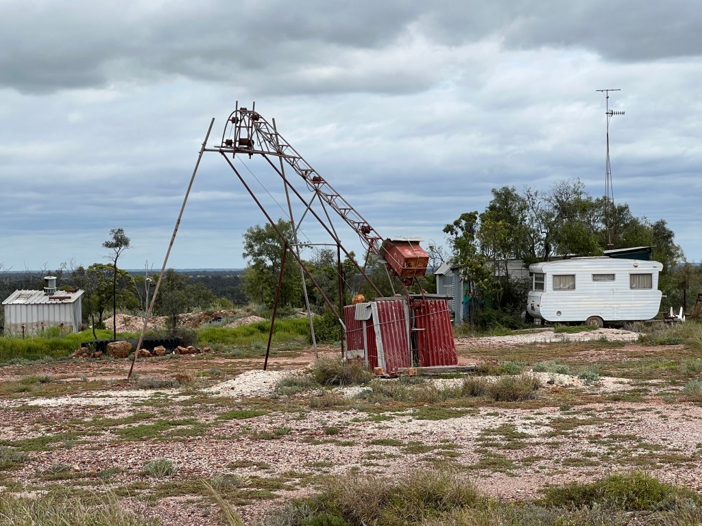 Lightning Ridge is a quirky place. The township is surrounded by opal mining activities, largely conducted by sole or family operators. Not something for large scale company outfits. The miners tend to live on their claim in what can best be described as shanty type accomodation. Old caravans and tin sheds, containers. Yesterdays ‘Tiny Houses’ that are currently the vogue among some! There are a few more substantial shacks made of local rock. Old equipment lies around rusting, old cars seem to have been left where they have stopped. Some of the miners come to their claims to mine during the winter months, gets very hot here in summer.