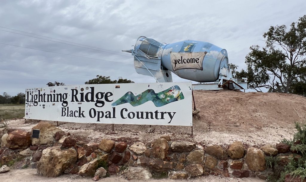 From Hebel it is 65 km or so to Lightning Ridge down the Castlereagh Highway. All day we have been travelling in a light sporadic spitty drizzle, enough to hassle the windscreen wipers. So it is good to finally see the welcome to Lightning Ridge display of the Barrel of Dreams, I think that is what it is called!