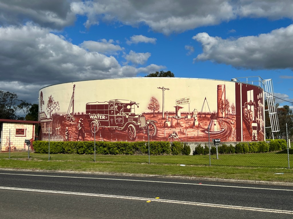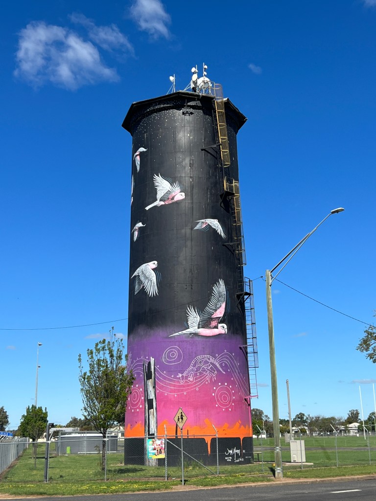 The town has a water tower and of course a mural has been painted on it, by the John Murray from Lightning Ridge. The base has an indigenous story line to add ‘country’ to the overall design. Quite impressive.