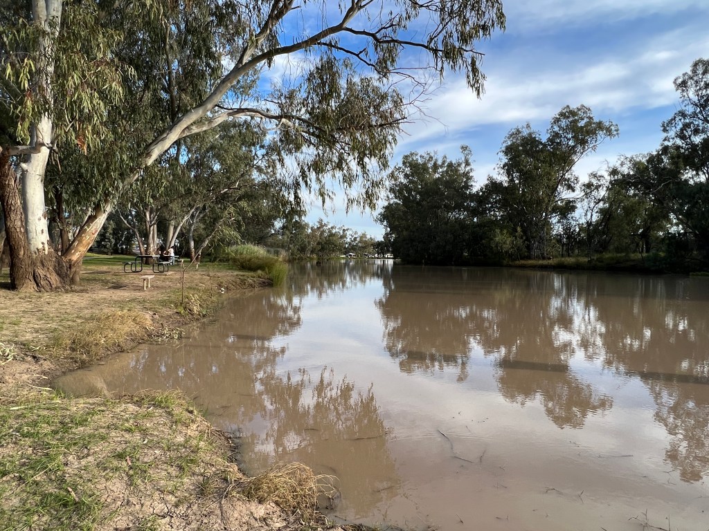The camp ground is beside the Castlereagh River, protected by a levee. The river is flowing at a great rate, well below the top of its banks so no worries flood wise for the town. The river is reported as actually the fasted flowing river in NSW. After rising in the Warrumbungles it flows more or less south and the west to Gilgandra before doing a loop ( looks like a fish hook) and then going north west to join the Macquarie River not far from that river’s junction with the Barwon River, which ends up in the Darling River near Bourke. For most of the time the Castlereagh is a dry sandy river bed and only flows after rains in the Warrumbungles area.