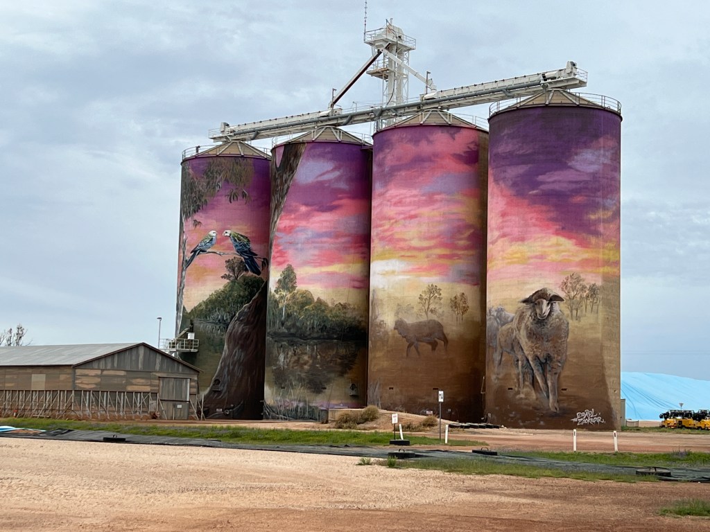 The big mural in Thallon is on the GrainCorp Silos. The mural is easily seen coming into town, dominating the skyline.It depicts the Moonie River, a sunset background with sheep grazing. Pretty spectacular.