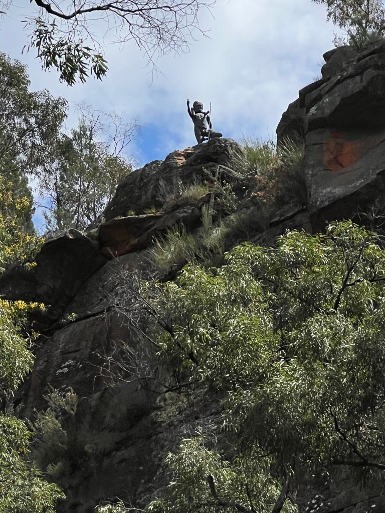 First Lesson , a father with child on his shoulders is looking out over the gorge ‘showing him the world’. It is particularly evocative. A bit later, in the walk through the gorge we look up at this statue on the ridge line. Quite impressive.